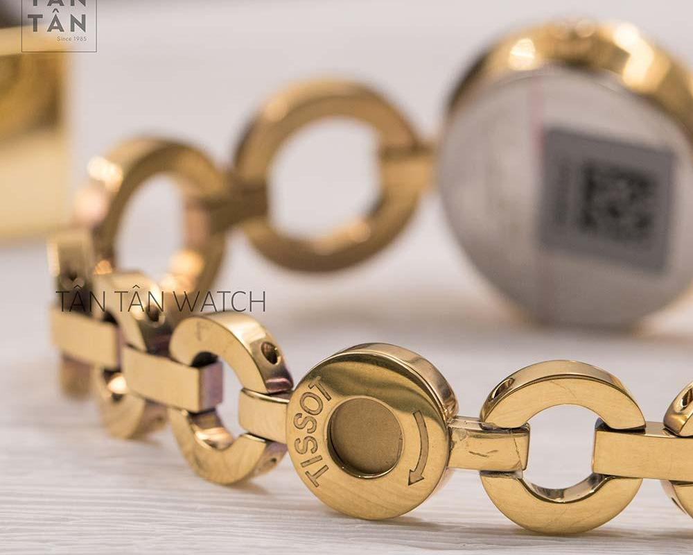 Dây đeo của đồng hồ T084.210.33.117.00 được làm bằng thép không gỉ cao cấp, sử dụng công nghệ mạ màu PVD vàng gold toàn bộ bề mặt, mang đến diện mạo thẩm mỹ cao, hợp thời trang và hài hòa với thiết kế. Dây đeo được các nghệ nhân chế tác theo dạng lắc tay thời trang độc đáo, với các mắt kim loại tròn liên kết với nhau tạo sự liền mạch và làm nổi bật vẻ đẹp nữ tính và dịu dàng của các cô nàng. Đi kèm là dạng khóa móc đơn giản dễ dàng đeo vào - tháo ra, tạo sự tiện lợi cho các nàng khi đeo lên tay.
