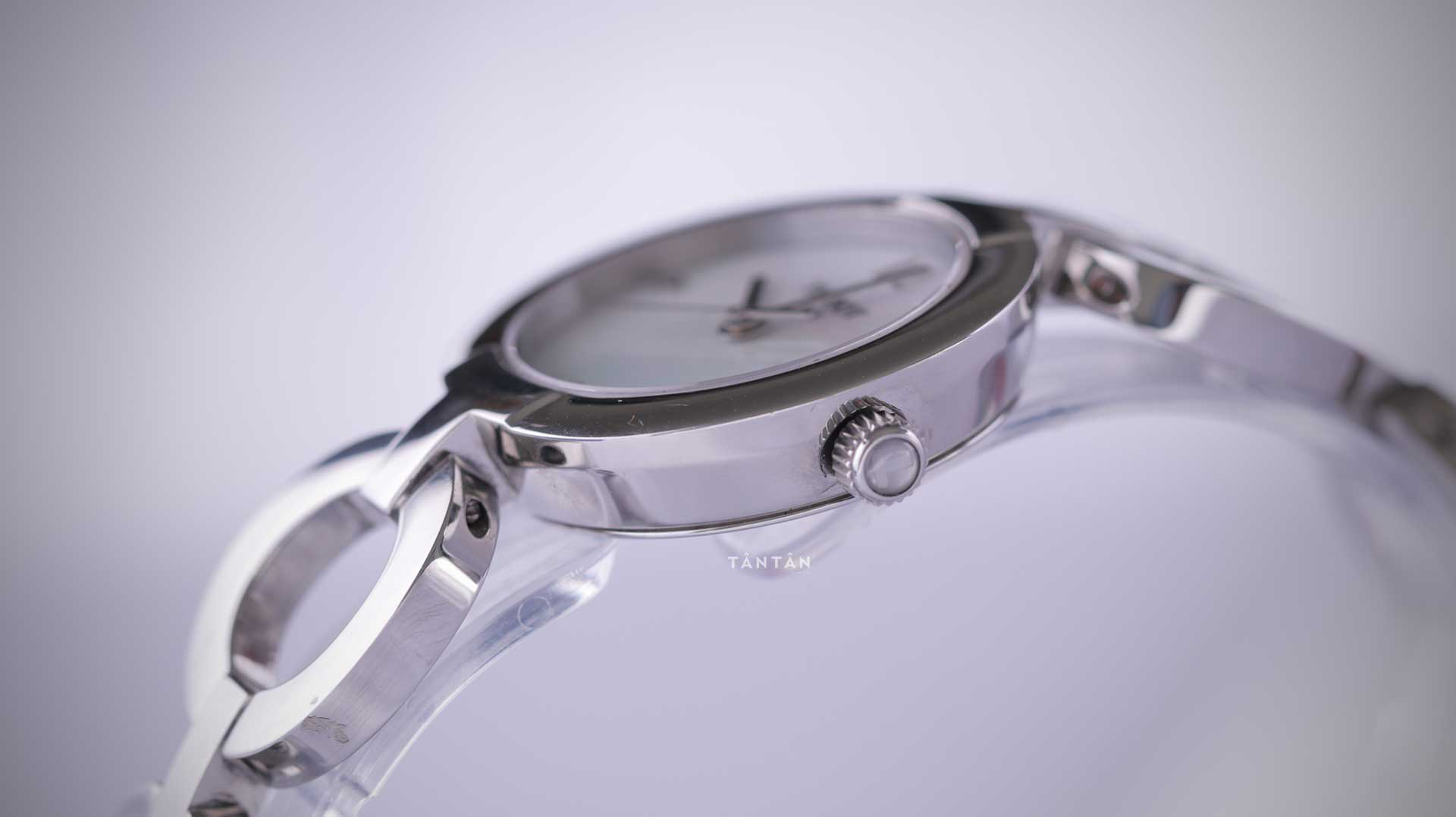 Đồng hành cùng lớp kính sapphire là bộ vỏ bằng thép không gỉ màu bạc sang trọng và bắt mắt. Chất liệu thép không gỉ không chỉ giúp đồng hồ bền đẹp với thời gian mà còn ngăn ngừa các tác nhân môi trường như sự oxy hóa của không khí, mồ hôi tay… Phần niềng bezel được bo tròn mềm mại và đánh bóng đánh bóng theo công nghệ cao. Đi kèm là nút chỉnh giờ màu bạc ở cạnh 3h với thiết kế dạng nắp chai có vân dọc giúp các nàng dễ dàng điều chỉnh khi dùng.