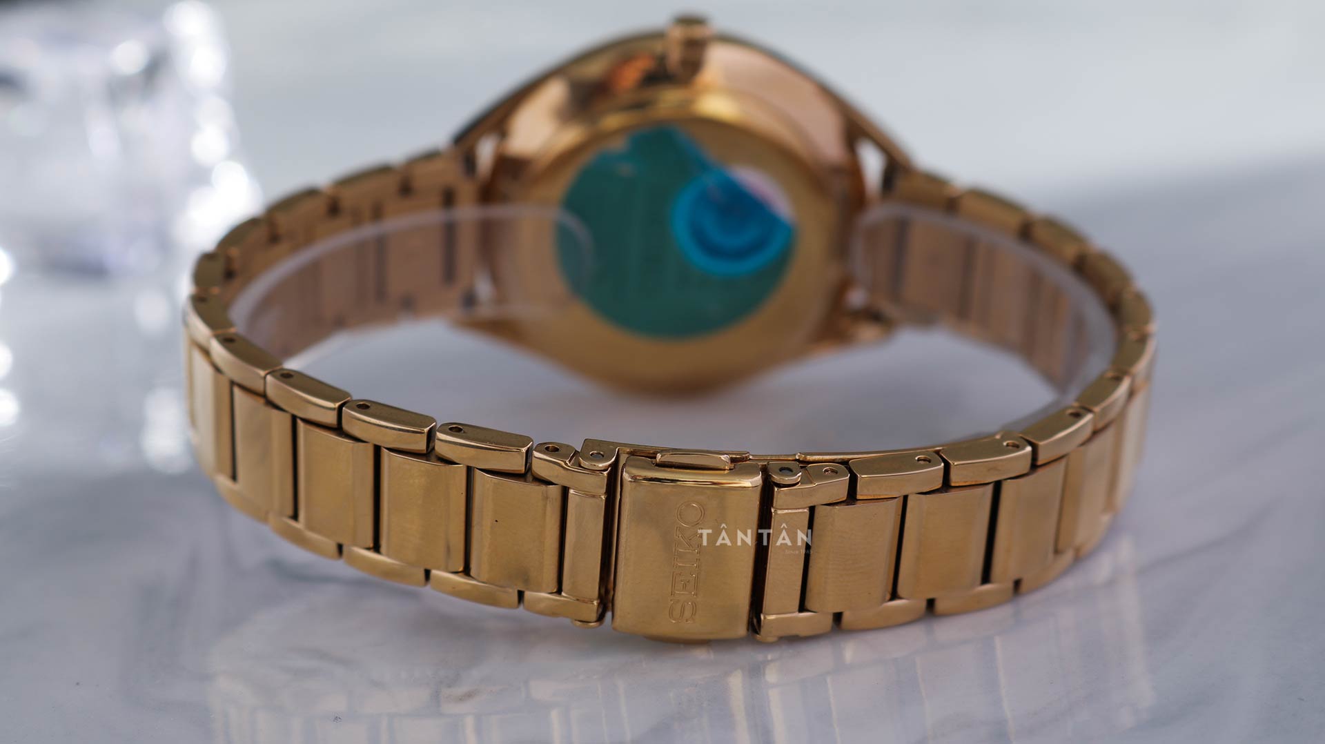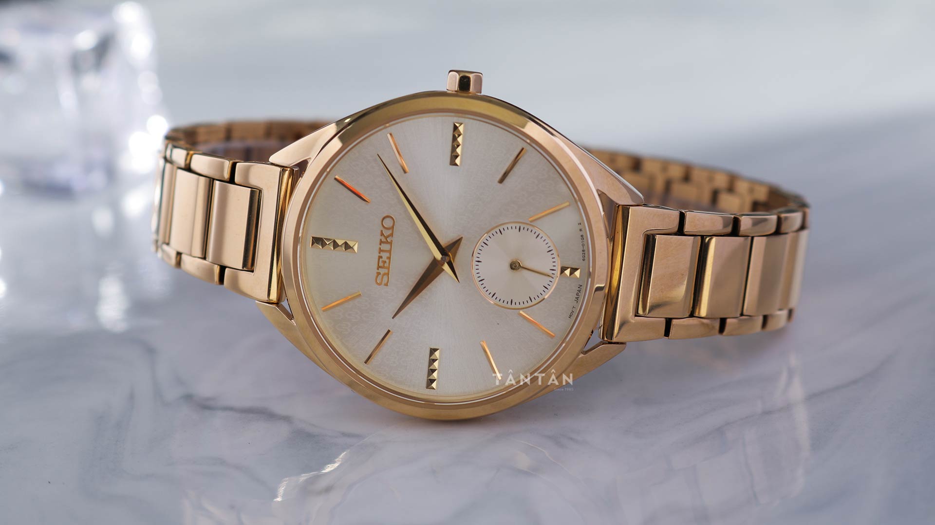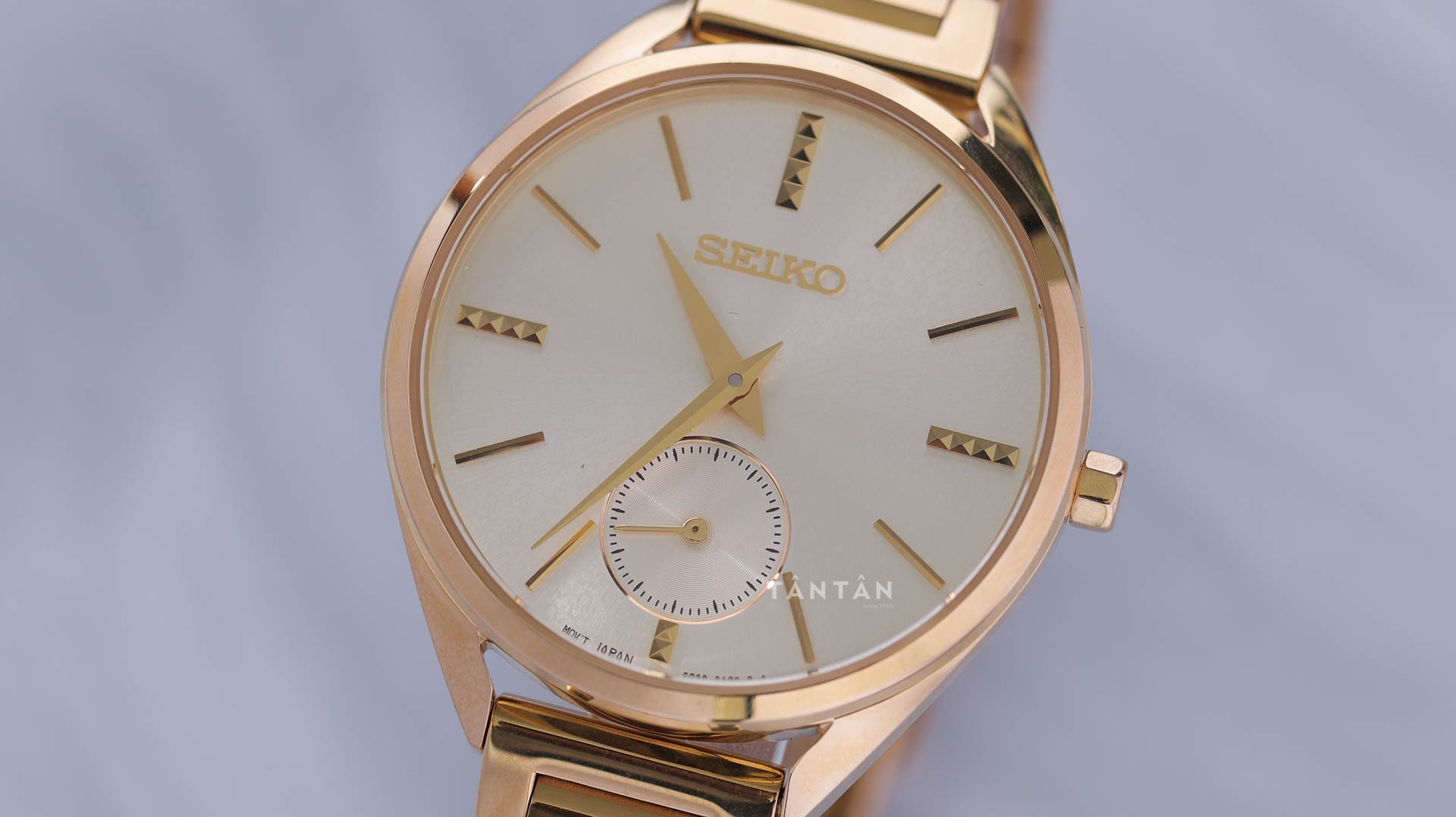 Đường kính mặt đồng hồ Seiko Nữ SRKZ50P1 thiết kế size 32mm, độ dày vỏ chỉ 7.1mm phù hợp phái nữ thích phong cách cá tính sang trọng và thanh lich. Dây và vỏ từ chất liệu thép không gỉ mạ PVD màu vàng với mặt số thiết kế vân nổi cùng kim Dauphine với mặt đồng hồ nhỏ phía 6h tạo nên nét cổ điển và sang trọng, cá tính của mẫu seiko SRKZ50P1, mặt kính cứng chịu lực tốt.