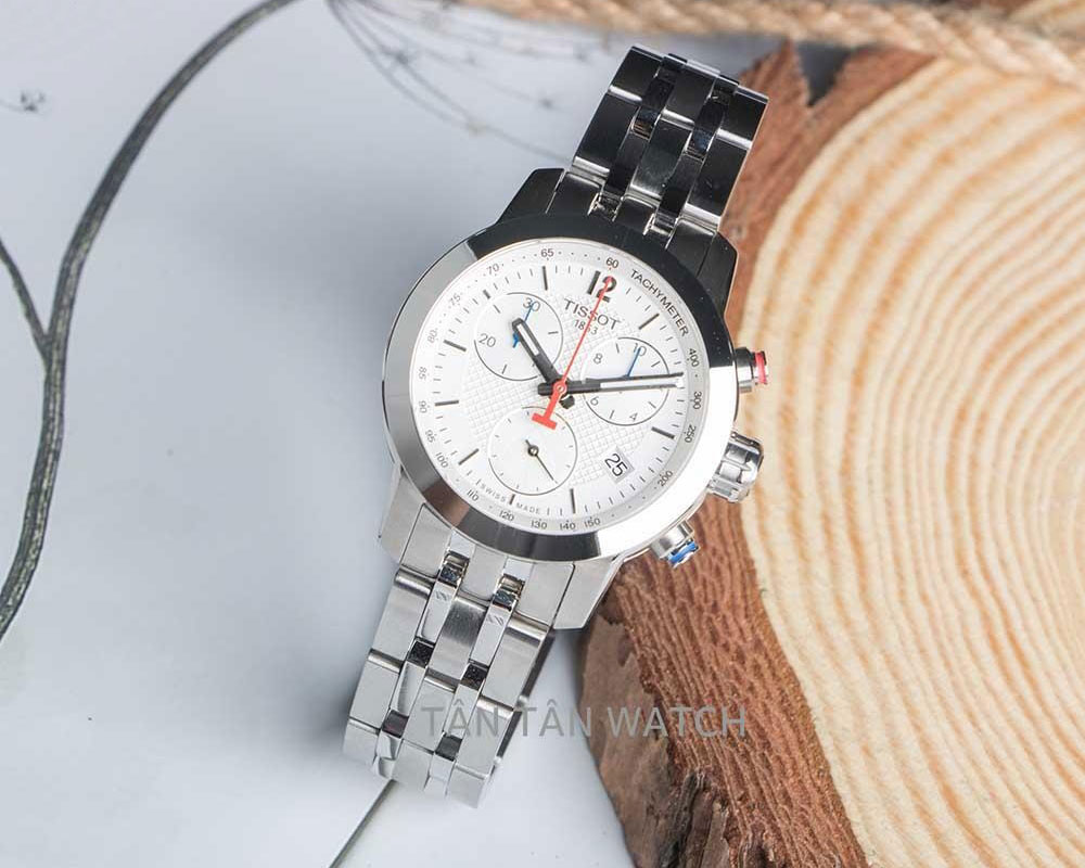 Mặt số của Tissot PRC 200 Tissot PRC 200 T055.217.11.017.00 kiểu multi-dial cho chức năng bấm giờ thể thao chronograph với những chi tiết độc đáo được sắp xếp và phân bổ cân đối, hài hòa tạo nên một tổng thể cực kỳ nổi bật. Trên gốc 12h vẫn là vị trí tên thương hiệu và dòng chữ 1853 thể hiện cho giá trị của một thương hiệu lâu đời. Bên trong mặt số là các ô của sổ phụ hiển thị cho tính năng bấm giờ thể thao chronograph: góc 2 giờ là ô tính 1/10 giây, 10 giờ là ô tính 30 phút và ô kim giây chính 60 giây ở góc 6 giờ. Mặt số đồng hồ có màu trắng ngà với thiết kế kiểu 2 lòng quen thuộc của Tissot, bên lòng trong đồng hồ được trang trí vân Texture Guilloche hơi hướng cổ điển, bên ngoài là các vạch giờ thanh mảnh được sắp xếp cân đối nhau giúp phần mặt số dễ nhìn và thông thoáng hơn.