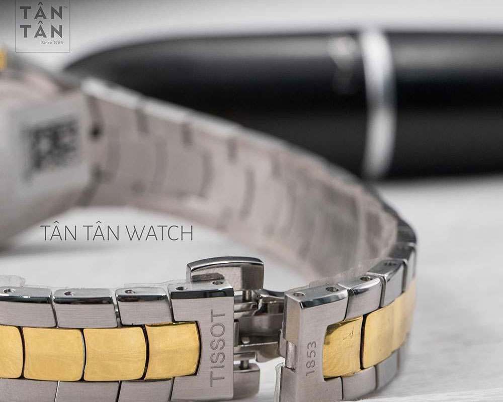 Để tạo sự mới mẻ và đáp ứng thị hiếu của phái đẹp hiện nay, Tissot luôn không ngừng đưa ra những cải tiến mới về thiết kế và chất liệu. Với mẫu đồng hồ T096.009.22.111.00, Tissot đã tạo nên điểm nhấn độc đáo bằng thiết kế dây đeo mang hai tông màu bạc - vàng nổi bật. Các mắt dây được thiết kế nhỏ gọn, liên kết với nhau chắc chắn , tạo sự thoải mái và dễ chịu khi đeo. Đặc biệt, “line” giữa của dây đồng hồ được mạ PVD màu vàng sáng bóng, vừa đồng bộ với thiết kế, vừa nâng tầm thẩm mỹ cho đồng hồ. Đi kèm là phần móc khóa cân bằng tiện lợi, giúp các nàng dễ dàng tháo ra, đeo vào khi sử dụng.