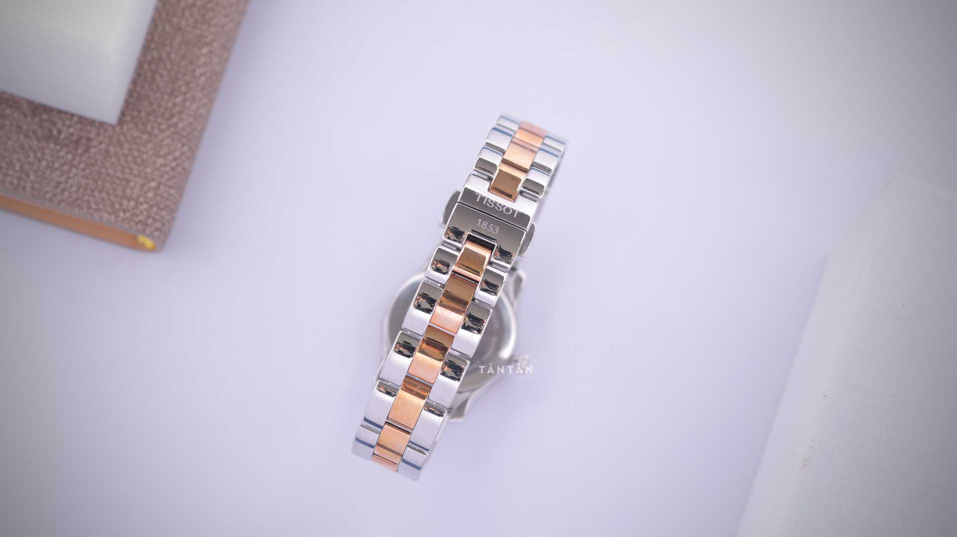 Bên cạnh đó, T112.210.22.113.01 được trang bị dây đeo thép không gỉ gồm 3 liên kết với các mắt xích bo cong kết nối liền lạc tạo nên một bản dây bền chặt mang tính ứng dụng thời trang cao. Để thêm phần nữ tính, thời trang đa dạng hơn, các mắt dây giữa được mạ PVD màu vàng hồng làm điểm nhấn demi thời thượng, giúp dây đeo không bị đơn điệu Đi kèm theo là khóa gập cân bằng gọn gàng kết hợp nút bấm tiện lợi dễ dàng tháo-mở, cố định trên cổ tay không bị bung ra khi vận động mạnh. Thêm vào đó, mặt khóa cũng được cắt gọt với những đường cong mềm mại và khắc chìm “Tissot 1853” đầy tinh tế.