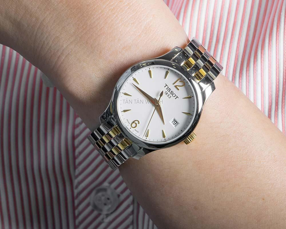 Với những đặc điểm trên, mẫu đồng hồ Tissot Tradition T063.210.22.037.00 rất thích hợp dành cho những cô nàng yêu thích sự đơn giản sang trọng, thanh lịch, mang nét đẹp cổ điển pha lẫn hiện đại. Một chiếc đầm xinh xắn, sang trọng trong một buổi tiệc hoặc một chiếc áo sơ mi thanh lịch chốn công sở đều có thể kết hợp cùng với Tissot Tradition T063.210.22.037.00 để khiến cho những cô nàng của chúng ta trở thành tâm điểm của sự chú ý.