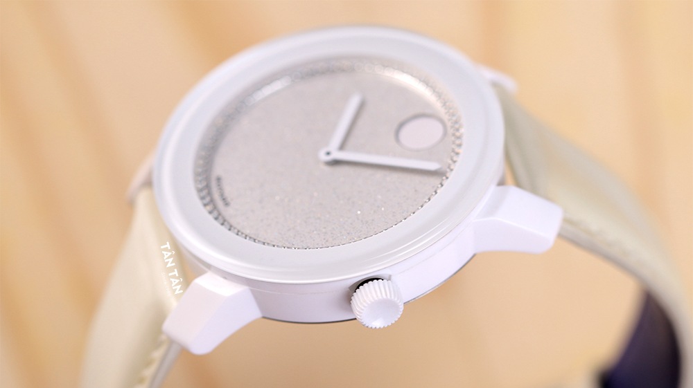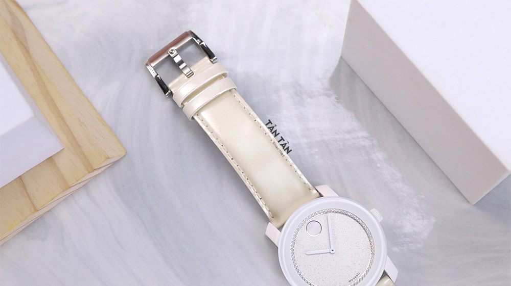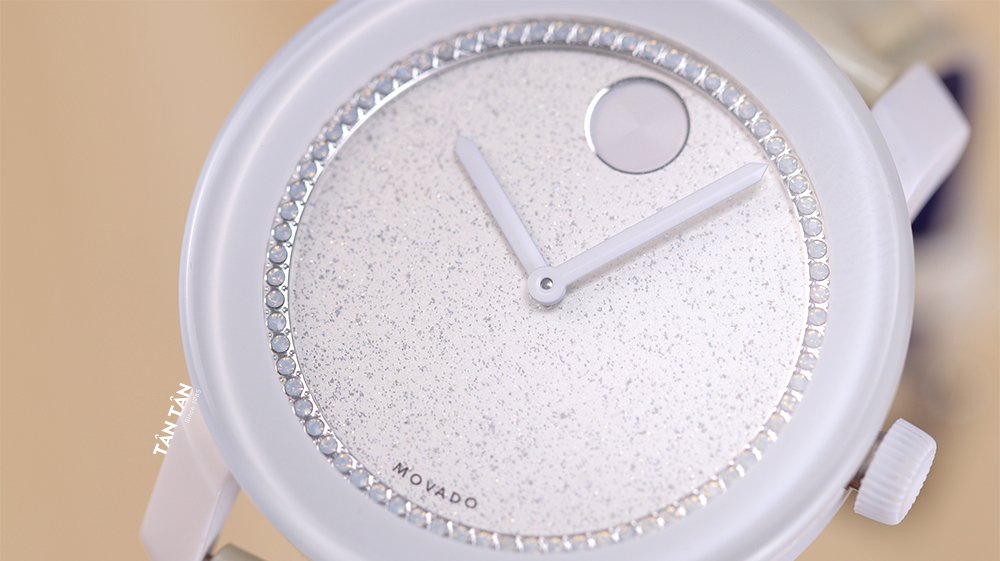 ✓ Mặt số màu trắng lấp lánh phun nhám độc đáo, nổi bật “một chấm hai kim” mang nét đặc trưng của Movado.