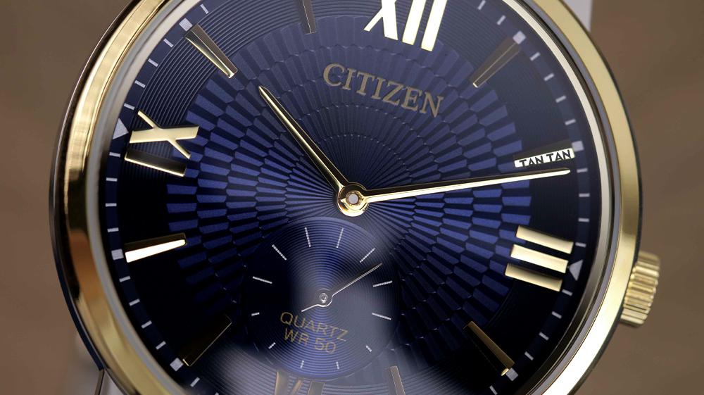 Mặt số của chiếc đồng hồ chính hãng Citizen BE9176-76L có màu xanh dương trẻ trung lịch lãm cùng những đường vân Guilloche lặp đi lặp lại xếp chồng nhau với độ chìm nổi rất đẹp mắt. Bên trong là các nếp gấp xếp chồng nhau tạo rẽ quạt độc đáo như mặt trời tỏa nắng đẹp mắt được bao bọc bởi lòng ngoài được hoàn thiện bởi các đường tròn đồng tâm. Cách hoàn thiện này giúp mặt số có hồn hơn, ẩn hiện đầy sang trọng mang đến sự chuyển màu độc đáo. Cọc số được thiết kế nét đơn cực kỳ đơn giản, nổi khối với các mốc 3-6-9-12 giờ dạng số la mã và được đánh bóng tỉ mỉ mang lại độ bắt sáng cao, vừa tạo điểm nhấn cho mặt số vừa thể hiện nét trẻ trung cho đồng hồ. Ở góc 12 giờ là logo Citizen được in sắc nét.