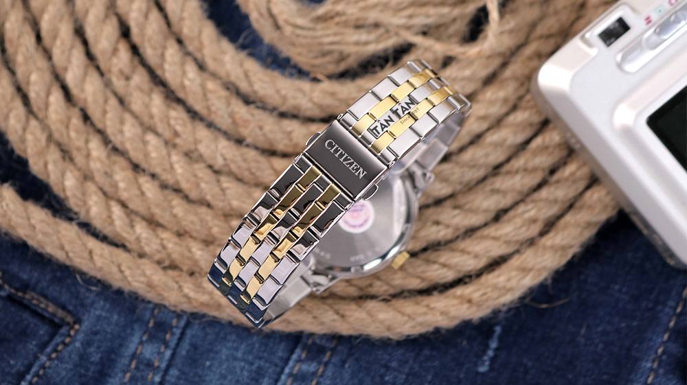 Citizen BE9176-76L sử dụng dây đeo chất liệu thép không gỉ chắc chắn, mạ màu demi vàng gold xen kẽ trên nền màu trắng bạc đồng điệu bộ vỏ. Dây đeo được thiết kế 5 liên kết uyển chuyển, giúp làm “mềm” đi chất thép và cực kỳ ôm tay, liền lạc nhau bởi khóa gập chắc chắn với nút bấm tiện lợi dễ dàng đeo vào hay tháo ra.