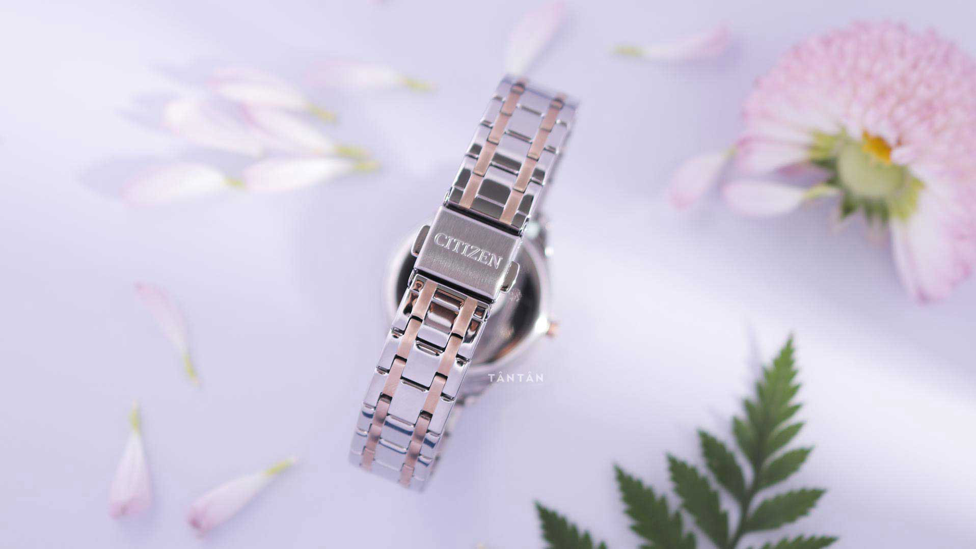 Bên cạnh đó, đồng hồ nữ Citizen EM0506-77A còn được trang bị dây đeo thép không gỉ nguyên khối với những tính năng nổi trội mà các loại chất liệu khác không có đó là độ bền, độ cứng cao hơn giúp chống trầy xước khi va chạm. Dây đeo cũng được hoàn thiện tỉ mỉ với những đường đánh bóng màu vàng hồng xen kẽ đánh phay xước tạo nên vẻ ngoài đồng hồ bắt mắt hơn, thời trang hơn khi nghiêng đồng hồ theo góc sáng bộ dây sẽ phản chiếu lại ánh sáng rất đẹp mắt. Đi cùng bộ dây là khóa gập với nút bấm tiện lợi và thẩm mỹ, với cơ cấu đơn giản các quý cô có thể sử dụng dễ dàng hàng ngày khi tháo ra và mang vào.