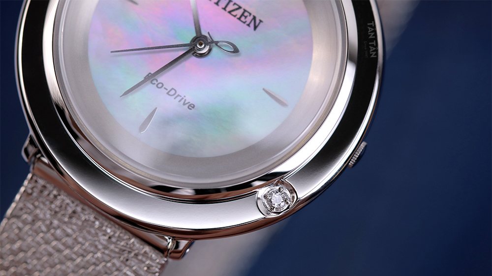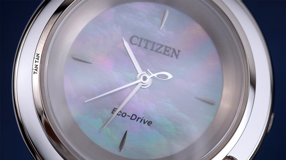 Mặt số tròn có vẻ đặt lệch một chút trên khung vỏ, được đặc cách thiết kế theo phong cách phi đối xứng lấy cảm hứng từ vẻ đẹp của vầng trăng khuyết. Mặt số khảm xà cừ màu trắng bạc mang tính độc nhất bởi chất liệu tự nhiên này, chưa bao giờ lặp lại ở mặt số thứ 2, như ngầm ý khẳng định “phiên bản duy nhất” của chị em. Kim giờ và kim phút được thiết kế thanh mảnh làm tăng thêm độ nữ tính, dịu dàng. Kim giây được chấm phá với phần đuôi uốn tạo hình chữ L cách điệu đặc trưng của BST Citizen L.