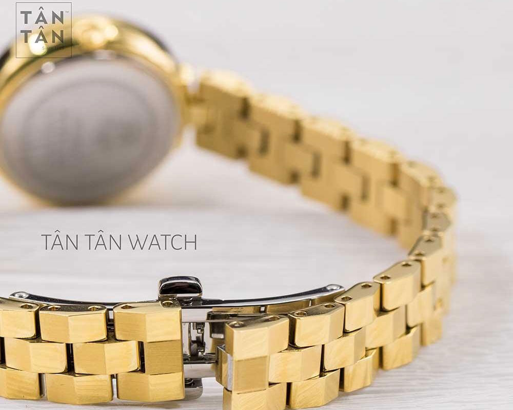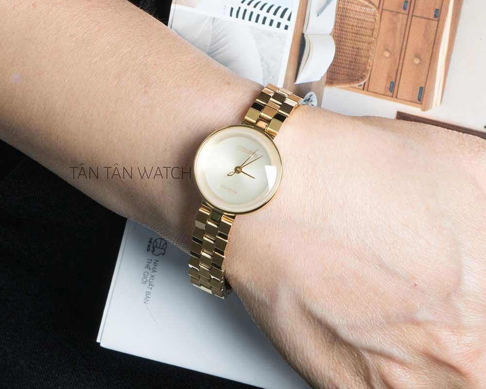 Citizen EW5502-51P có mặt số hình tròn nhỏ xinh với kích thước 24.6mm cùng với thiết kế tối giản màu vàng gold tổng thể
