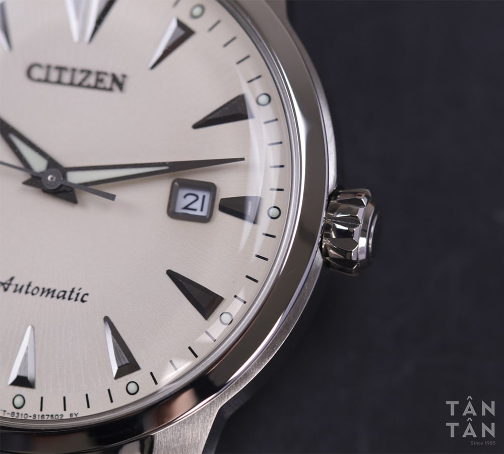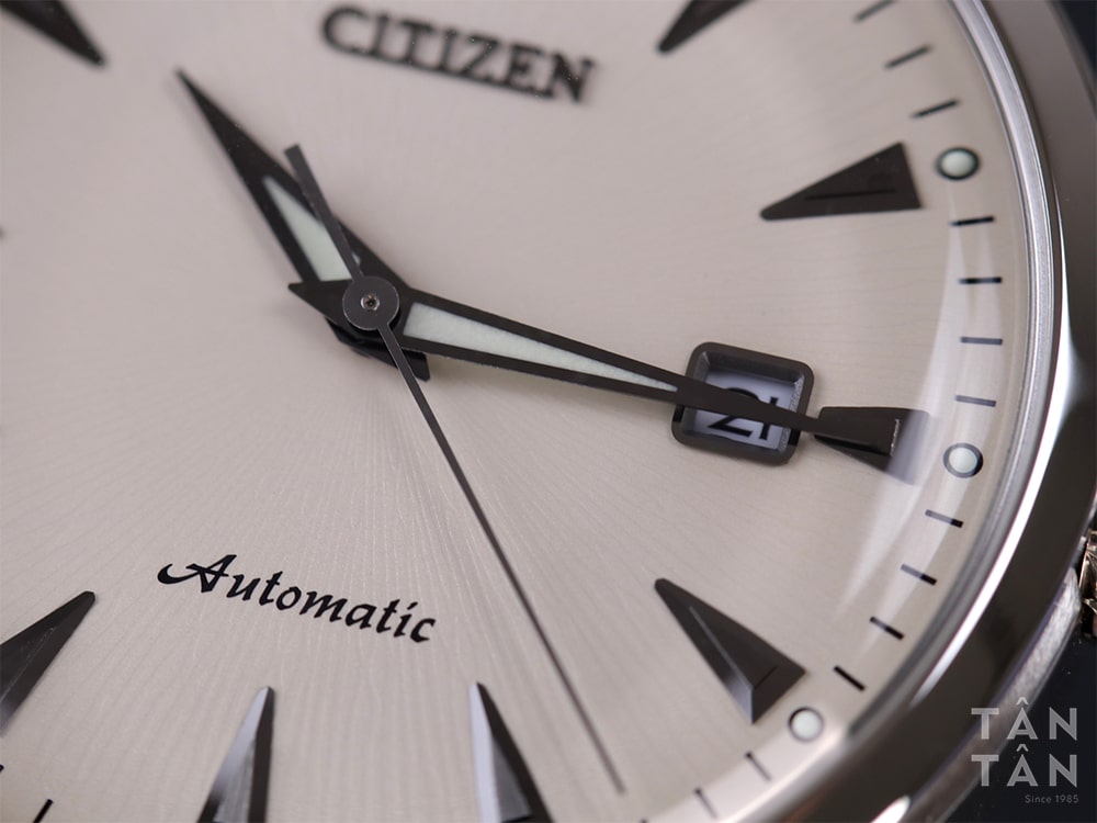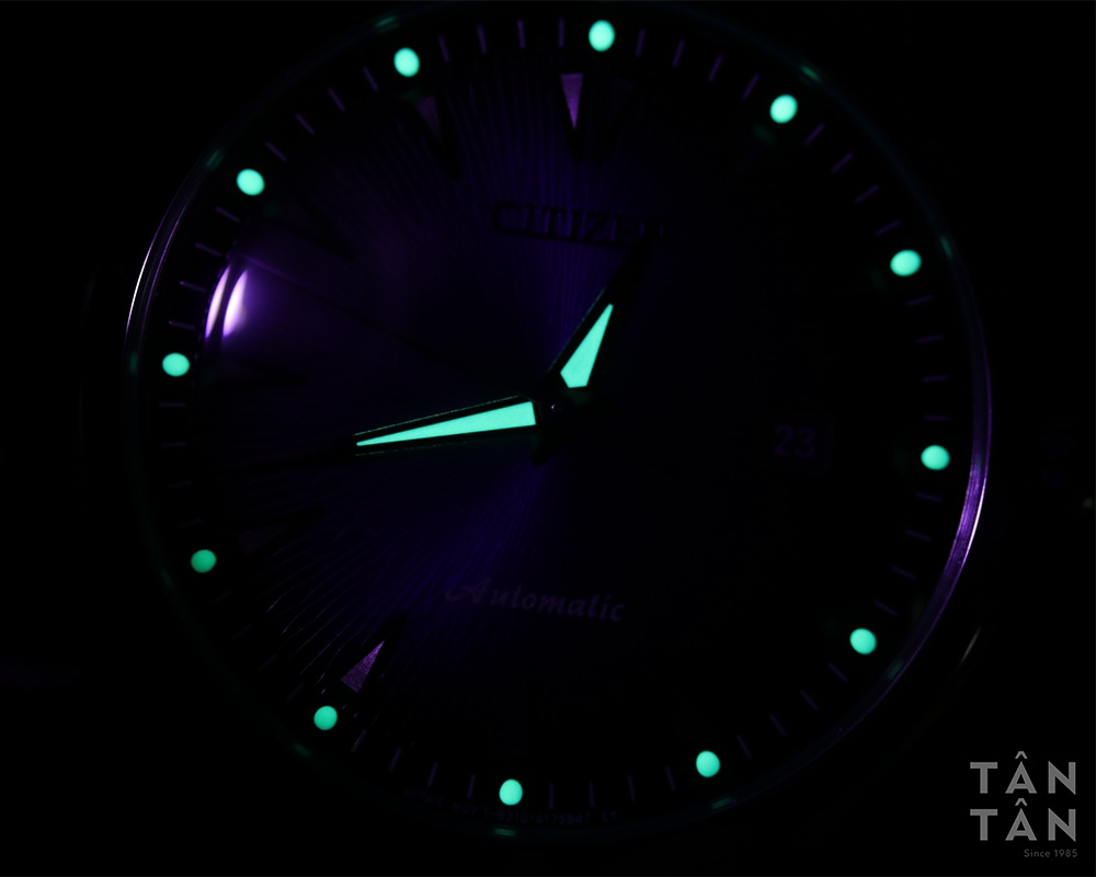 Tại vị trí các cọc giờ, Citizen NK0001-17X được trang bị các chấm tròn phủ dạ quang kết hợp cùng bộ kim sẽ giúp người đeo có thể quan sát giờ giấc trong điều kiện tối. Ô lịch ngày được hoàn thiện rõ ràng với viền thép sáng bóng, nổi bật.
