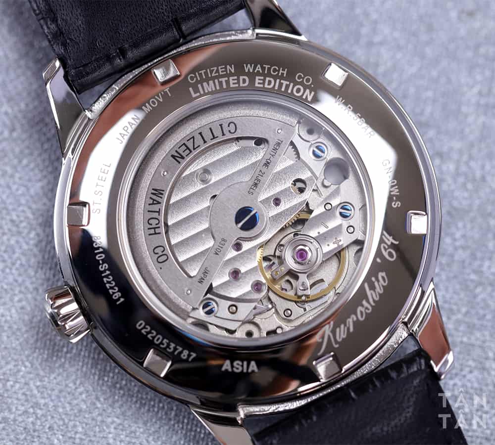 Ở mặt đáy, Citizen NK0001-17X có thiết kế lộ máy và được bảo vệ bằng kính Sapphire có độ cứng cao giúp bảo vệ bộ máy bên trong một cách an toàn nhất. Ngoài ra, mặt đáy còn in số hiệu của chiếc đồng hồ, đánh dấu đó là chiếc thứ bao nhiêu trong 1959 chiếc được sản xuất.
