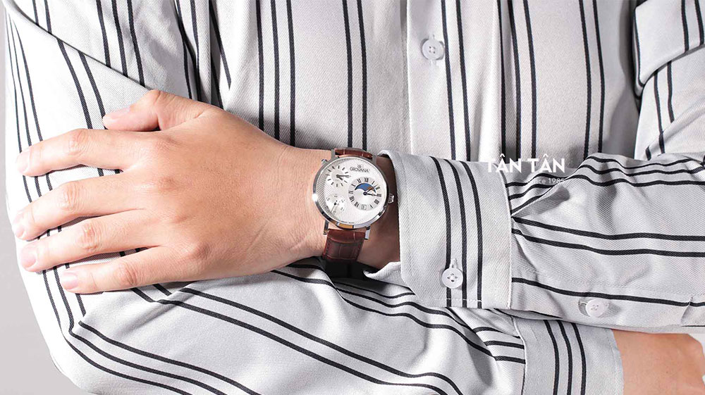 Khi chưa có các tiến bộ khoa học, con người dựa vào ánh nắng mặt trời và chu kỳ của mặt trăng để xác định thời gian. Mỗi kỳ trăng đều ảnh hưởng đến cuộc sống của con người từ gieo trồng, canh tác đến tôn giáo… Và tập tục xa xưa của tổ tiên được con người vận dụng sáng tạo mô phỏng gói gọn trong bộ lịch tuần trăng. Hãng Grovana của Thụy Sĩ cũng đi theo sự sáng tạo đó chế tác nên mẫu Grovana 1711.1532 tích hợp chức năng lịch tuần trăng, chức năng giờ GMT, múi giờ chính, cửa sổ ngày hiện tại.