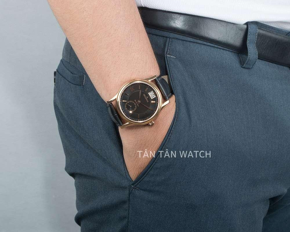 Mẫu đồng hồ nam Grovana 1725.1567 thuộc bộ sưu tập Grande Date, thiết kế phong cách thanh lịch đặc trưng của hãng Grovana Thụy Sĩ. Bộ vỏ thép không gỉ màu vàng hồng ôm mặt số màu đen cùng tông với bộ dây da dập vân cá sấu là chiếc phụ kiện góp phần làm nên outfit quý ông lịch lãm.