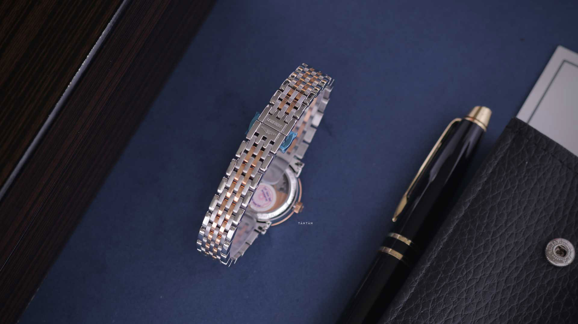Longines Elegant L4.310.5.87.7 được hoàn thiện bằng dây đeo kim làm làm từ thép không gỉ cao cấp bọc vàng hồng 18K dọc 2 liên kết tạo hiệu ứng demi sang trọng. Chất liệu này tạo ra độ bóng tự nhiên, bắt sáng tốt và mang đến sự sang trọng cho người dùng. Cùng với đó, các mắt kim loại nhỏ được sắp xếp đan xen giữa gam màu vàng hồng và bạc tạo nét độc đáo, ấn tượng ngay từ cái nhìn đầu tiên. Đây là kiểu dây đeo hình “hạt gạo” thon dài đặc trưng của thương hiệu Longines giúp dây đeo uyển chuyển, mềm mại ôm chặt cổ tay hơn. Ngoài ra, dây đeo có khóa đôi được thiết kế chốt gấp ba lần an toàn và mở theo cơ chế đẩy, dễ dàng tháo ra và lắp vào, giúp cố định vừa vặn và chắc chắn trên cổ tay.