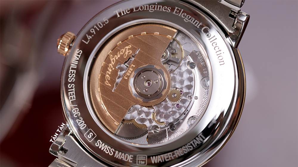 Longines Elegant L4.910.5.77.7 sở hữu bộ máy cơ Automatic L888.3 tiêu chuẩn Thụy Sỹ được kiểm định nghiêm ngặt về chất lượng, hoạt động hoàn toàn tự động dựa trên chuyển động của cổ tay người đeo. Bộ máy này được cải tiến từ bộ máy ETA caliber A31.L01, mang lại hiệu suất vượt trội và mạnh mẽ cho đồng hồ. Bộ máy của Longines Elegant L4.910.5.77.7 có 21 chân kính với tần số 25.200 nhịp/giờ và mức dự trữ năng lượng dao động 36-40 giờ, cho phép đồng hồ hoạt động mượt mà và bền bỉ trong một khoảng thời gian đủ dài.