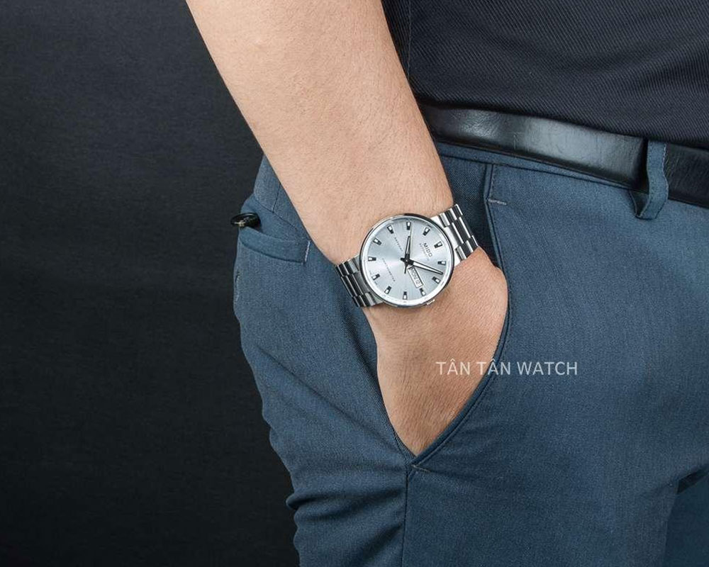 Mido M014.431.11.031.00 có đường kính mặt số 40 mm, dày 11.2 mm vừa vặn trên cổ tay của đa số các chàng trai Việt. Độ chịu nước của đồng hồ đạt 5ATM (tương đương 50 mét nước) cho phép các chàng rửa tay hay gặp những cơn mưa bất chợt cũng không lo đồng hồ bị vô nước.