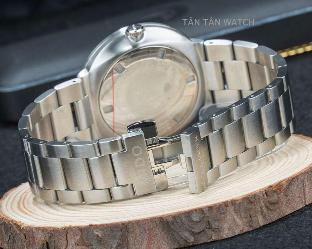 Toàn thân dây đeo đều được chải xước phay cẩn thận làm nên vẻ ngoài bóng loáng, sang trọng. Mido M014.431.11.031.00 có độ rộng dây 21mm không quá nặng tay nhưng đủ để các chàng cảm nhận được sự chắc chắn và mạnh mẽ. Phía cuối dây đeo là khóa cân bằng gọn gàng với nút bấm tiện lợi giúp giữ đồng hồ luôn ôm chặt cổ tay các chàng.