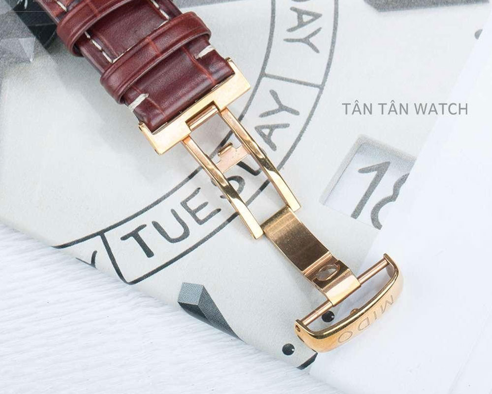 Dọc theo chiều dài dây đeo là hai đường chỉ may màu trắng nổi bật trên nền da nâu. Từng đường kim mũi chỉ đều đặn, thẳng tắp cho thấy được sự tỉ mỉ và chỉn chu trong từng chi tiết của thương hiệu Mido. Kết hợp cùng với dây đeo thanh lịch là khóa gập kim loại cứng cáp giúp giữ đồng hồ chắc chắn trên tay các quý ông. Đây là loại khóa thường áp dụng trên những màu dây da cao cấp bởi khả năng cân bằng và tránh dây bị hư, gãy khi đeo vào - tháo ra thường xuyên.