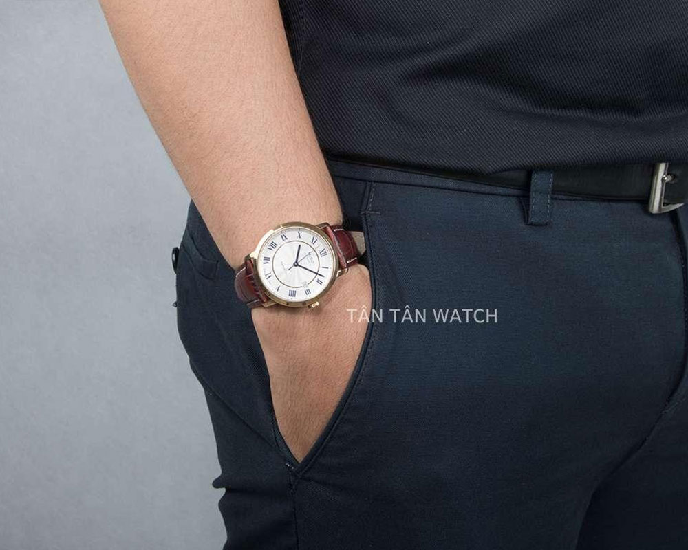 Bộ vỏ thép chỉ 37mm mạ màu vàng gold đi kèm dây da nâu lịch lãm trên cổ tay nam giới