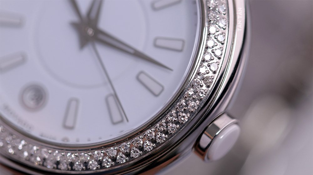 ✓ Bộ vỏ thép không gỉ được đánh bóng sang trọng với niềng bezel đính 120 viên kim cương nổi bật.