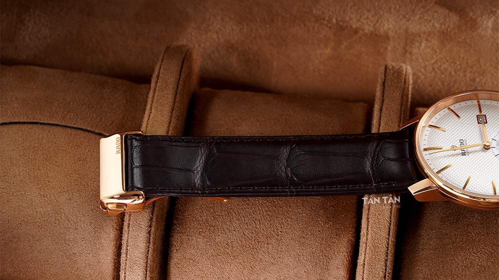Với tông màu nâu đen trầm ấm, dây đeo Rado R22881025 khi kết hợp cùng mặt số trắng đã tạo thành một mẫu đồng hồ nam tính và mạnh mẽ, có tính ứng dụng cao, đồng thời làm tôn lên nét sang trọng của những quý ông đang sở hữu mẫu đồng hồ này. Rado R22881025 thuộc dòng đồng hồ Rado dây da nên dây đeo được chế tác từ chất liệu da cao cấp bền nhẹ giúp cho người dùng có thể sử dụng thoải mái mà không hề đem lại cảm giác khó chịu khi lên tay. Dọc viền dây là đường chỉ tệp màu được may một cách khéo léo và tinh tế mang đến độ bền chắc, qua đó cho thấy bàn tay tỉ mỉ của những người nghệ nhân đẳng cấp thế giới. Đi kem với dây da là khóa cài tiện lợi, dễ dàng đeo vào - tháo ra giúp cố định chắc chắn trên cổ tay các chàng trai.
