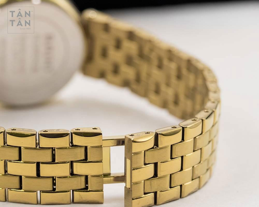 Nối với bộ vỏ là dây đeo thiết kế 5 mắt làm bằng thép không gỉ cao cấp, dạng chữ nhật như những viên gạch xếp chồng lên nhau của các bức tường kiến trúc. Các mắt dây được mạ màu vàng gold phủ satin bóng toàn bộ rất thu hút và ấn tượng. Với kiểu thiết kế này, dây đeo mang lại sự gọn gàng, chắc chắn và cực kỳ ôm tay.