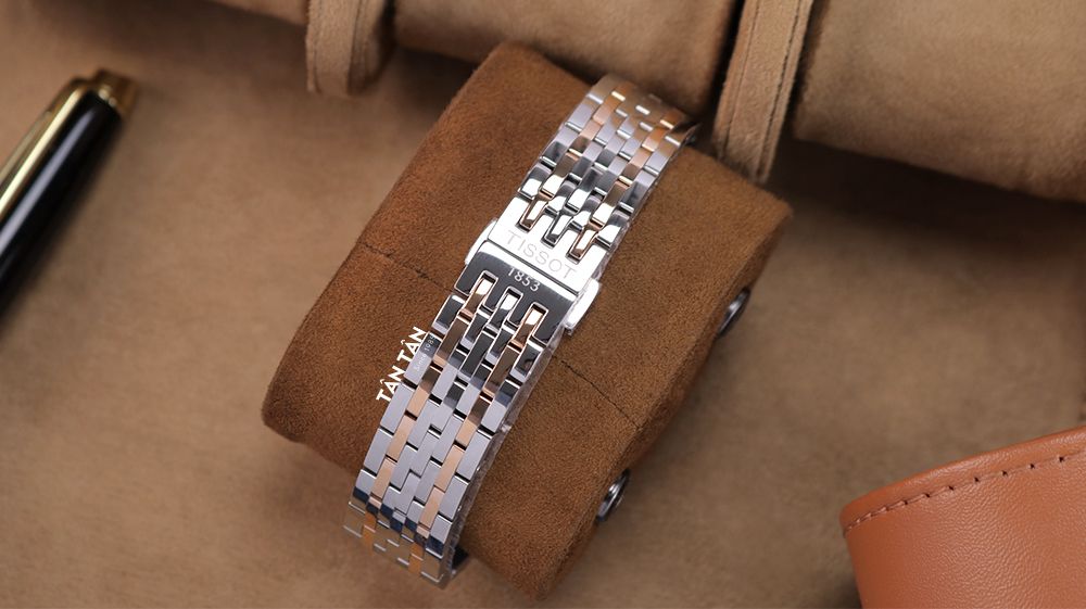 Ở cạnh phải là núm chỉnh dạng nắp chai được hoàn thiện sắc sảo với các đường khía rãnh và logo chữ T đặc trưng của Tissot được khắc nổi trên bề mặt núm, một lần nữa khẳng định giá trị thương hiệu. Niềng bezel có thiết kế bo tròn mềm mại, mạ màu vàng hồng thêm điểm nhấn nổi bật cho mặt số, được đánh bóng tỉ mỉ đồng bộ với bộ vỏ tạo nên một tổng thể thiết kế hài hòa, dịu mắt. Với đường kính vỏ 39.3mm, mẫu đồng hồ này sẽ phù hợp cho cổ tay từ 15.5cm cùng độ chống nước 3ATM hỗ trợ đi mưa và rửa tay.