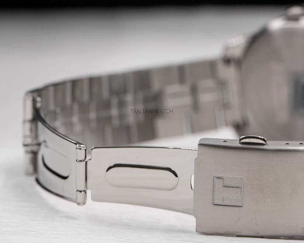Với chất liệu thép không gỉ 316L, mẫu dây đeo này không thấm nước, mồ hôi nên không gây ra mùi khó chịu cho dù các quý ông đeo trong khoảng thời gian dài. Đồng hồ còn được trang bị khóa gập tiện lợi dễ dàng tháo ra và đeo vào. Trên bề mặt khóa có logo Tissot khẳng định giá trị thương hiệu trong thiết kế.