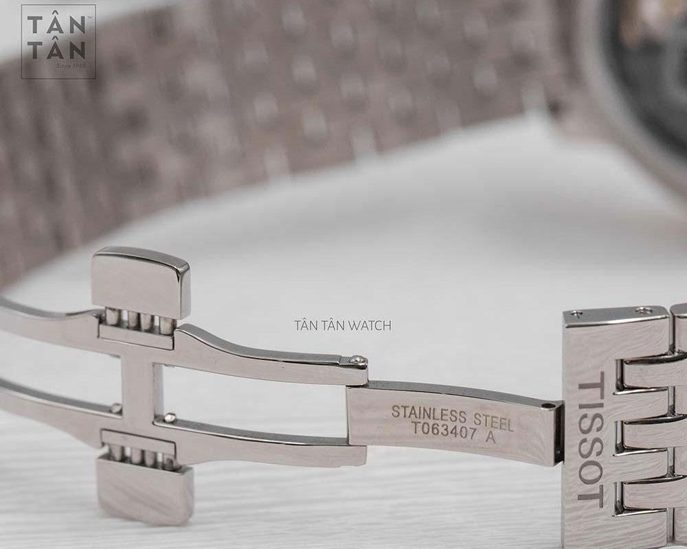 Tissot T063.907.11.038.00 được trang bị bộ dây thép không gỉ được hoàn thiện bề mặt sáng bóng đậm nét cổ điển và sang trọng. Thiết kế 7 mắt xích liên kết chặt chẽ với nhau, uyển chuyển và ôm trọn cổ tay cùng chất liệu cứng cáp, bền chắc trước va đập mang đến thời gian sử dụng dài lâu. Đi kèm theo thiết kế dây này là khóa gập cân bằng gọn gàng giúp dây đeo liền lạc hơn, kết hợp nút bấm tiện lợi dễ dàng tháo-mở, cố định trên cổ tay không bị bung ra khi vận động mạnh. Thêm vào đó, mặt khóa cũng được cắt gọt với những đường cong mềm mại và khắc chìm “Tissot 1853” đầy tinh tế.